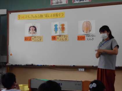 朝ご飯に黄色・赤・緑の3つの栄養素を意識してとることで,頭のスイッチ・体のスイッチ・おなかのスイッチが入ることを教えていただきました。