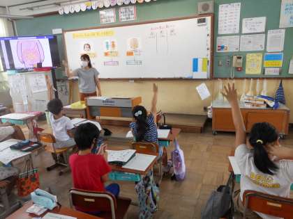 栄養教諭の先生と一緒に朝ご飯の大切さについて学習しました。