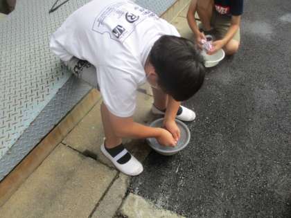 家庭科の「夏をすずしく さわやかに」で洗濯の仕方を学習しました。今日は実際に洗濯してみました。まずは水に洗剤を入れ,洗いました。いろいろな洗い方を試していました。その後,何度か水をかえてすすぎました。ずいぶんきれいになりました。