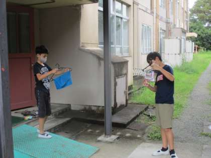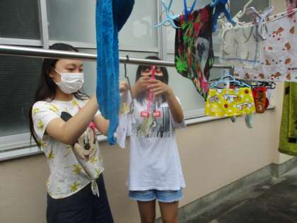最後によく絞って干しました。しわにならないようにするにはどうしたらいいか,早くきちんと乾くためにはどうすればいいかを考えながら,ハンガーにかけたり,洗濯ばさみではさんだりして干しました。