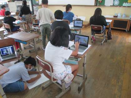 その画像をロイロノートで共有して,それぞれが考えた構図に合わせて線描を進めています。