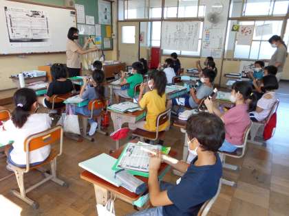 「パフ」の練習をしています。全員でそろってリコーダーの演奏することは,今の状況では難しく,指使いに練習しかできません。正しく穴を抑えられているかを確認しながら,学習を進めています。家での練習を重ねておいて,全体で合奏できる日が来ることを願っています。