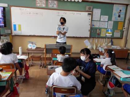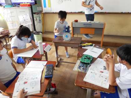 物の重さを計る道具として,台秤を使いました。1Kg用のはかりの目盛りは,1目盛りが何gになるかを確かめてから,教科書や筆箱などの重さを計りました。あらかじめ重さを予想してみて,近い重さであったときに「やった。」と喜んでいました。