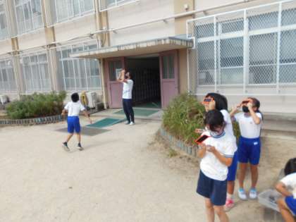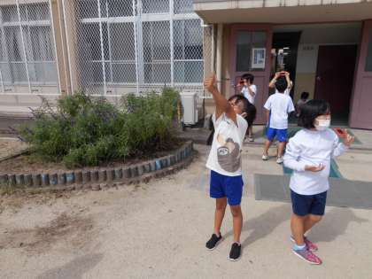 12時の太陽のいちを調べようと思ったのですが,厚い雲のために観察できませんでした。給食を終えた後の昼休みの観察です。午後1時の太陽の位置は,南東の方角で,こぶしで6個分の高さでした。