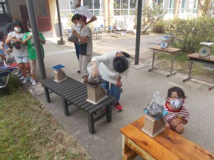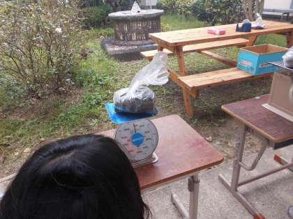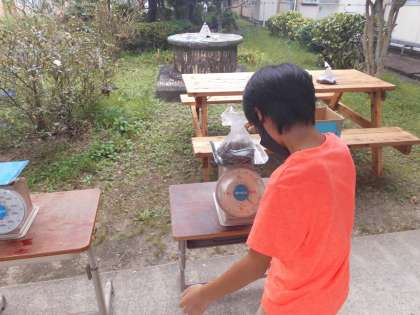 教室にある物で,1kgの重さになるものがテープカッターだということで,それを手に取って,重さの感覚を確かめて,中庭に用意した砂を袋に詰めていきました。