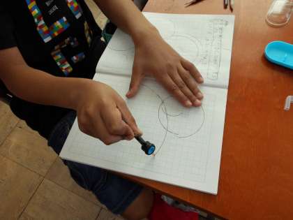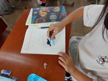 教科書のふろくの吹きゴマを作ってみました。ストローで吹き続けると勢いよく回るはずでしたが,コツがつかめず1〜2回転しかさせることができませんでした。回った時の形は,丸いことから,簡単に丸い形を書く道具としてコンパスを使う練習もしました。こちらもなかなかうまく回せませんでしたが慣れてきた子どももいていくつもノートに円を描いていました。
