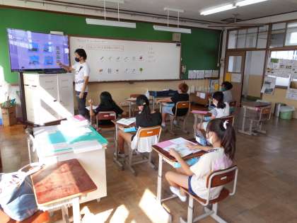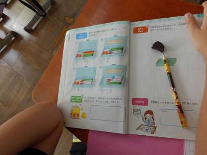 文具を英語で表現しています。4人の友だちの筆箱の中身を聞いて,どれが誰の筆箱かを選ぶことができました。それぞれ,鉛筆の数やペンの色,定規の有無などを聞き分けて,判断していました。