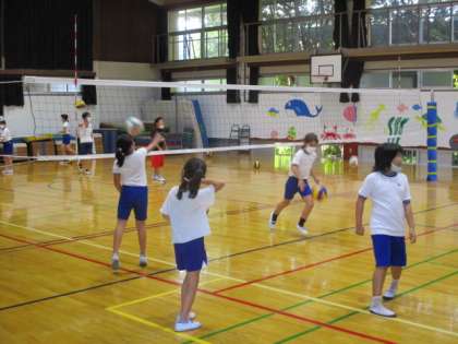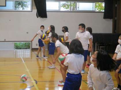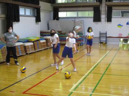 バレーボール部の様子です。まずはサーブ練習。なんとかネットを越そうと,思い切ってボールをとばしていました。その後はチームプレーで相手コートに返すため,必死にボールを追いかけていました。