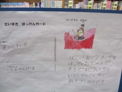 図書館の中に,1年生がおすすめの本をしょうかいしたポスターが並んでいます。ぜひご覧ください。