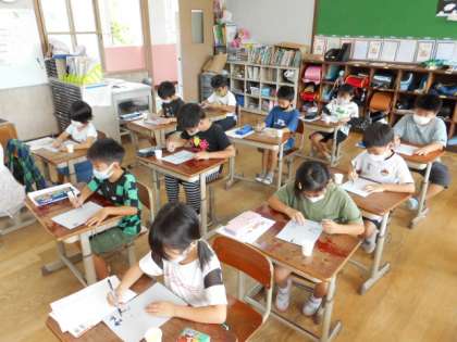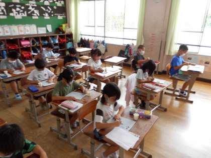集中して,良い姿勢で丁寧に字を書いています。「画の長さ」や「画の間」など,普段分かっているけれども,なかなか意識できないようなことも,一つずつ確認しながら書いています。「水書(水をつけて書く筆ペンのようなもの)」に取り組んでいるところです。