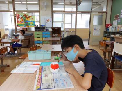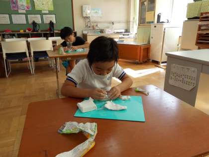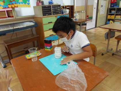 「好きな食べ物をのせるお皿を作るとしたら,どんなものがいいかなあ」と想像をふくらませながら作品作りをしました。