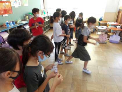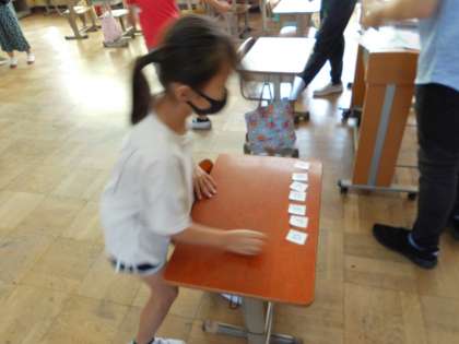 アルファベットの順を覚えるゲームをしました。AからZまで書いたカードをもって,グループごとに順に並べていきます。カードの束からAを1枚並べたら,次の人にカードの束を渡して,次々と並べていきます。お互いに,アルファベットを言いながら,次のカードを探して,並べていきました。
