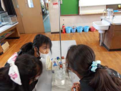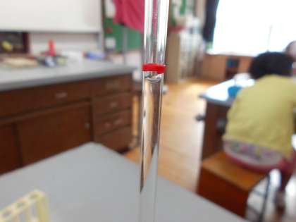 水を温めると,体積がどうなるか調べました。細いガラス管の中で,水面の位置がかわる様子を観察して,体積が,確かに変化していることを確認しました。