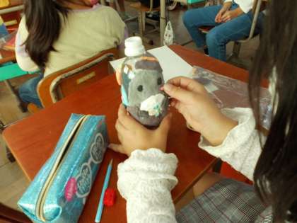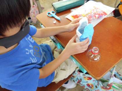 ペットボトルや小さな容器のまわりに,色をつけた紙粘土をはりつけて素敵な入れものを作っています。容器のまわりの模様を考えたり,絵の具を混ぜて紙粘土の色を工夫したりして,楽しんで作っています。