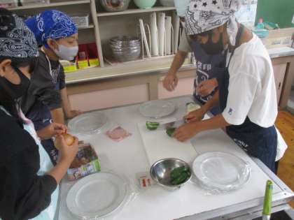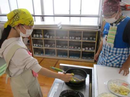 家庭科の「朝食から健康な1日の生活」の学習で,炒める調理の実習をしました。班で3つの野菜を考え,ハムと一緒に野菜炒めを作りました。自分の分の食材を自分で切り,自分で炒めて完成させました。