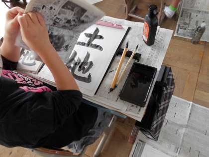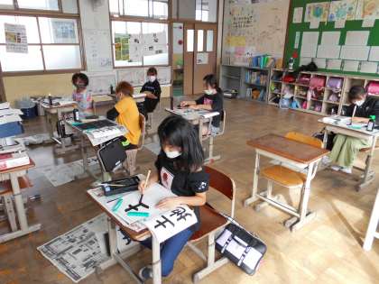 習字で左右の組立てに気をつけて「土地」の字の練習をしました。手本をなぞりながら練習し,力強く清書していました。