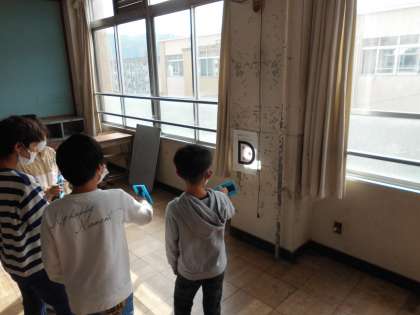 「的あてゲームで,的に当てるものは光です。」「え〜。」「光をどうやって・・・?」かげに置かれた的に,鏡を使って光をはね返しました。うまく当たる人。全然,光がとどかない人。よく見ると,かげの中に立っていました。天気が悪く,日光が出ない時には,スポットライトの光で的あてをしました。