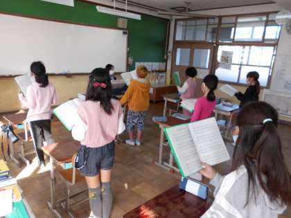学習発表会に向けて,毎朝,歌声を響かせています。高い音にも,口をしっかりと開けて,7人が力を合わせて歌っています。