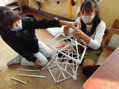 図工「つなぐんぐん」の学習では,つないで出来る形の感じを見つけ,つなぎ方を工夫して作品を作りました。「マンションが出来た!」「ブランコです!」。みんなで協力して作った作品が完成しました。