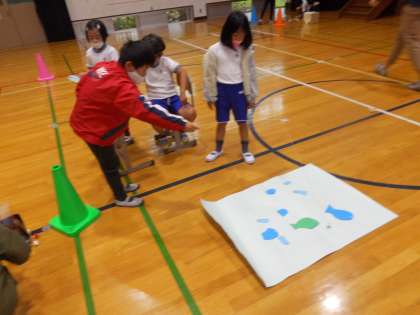 あいにくの天気だったので,体育館での遊びに招待してもらって,みんなとても喜んでいました。