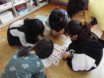 雨の日の遊びは、、、教室で。今日は「7ならべ」をしていました。みんなでわいわい賑やかに遊んでいました。雨の日は,あやとりとトランプがブームなようです。