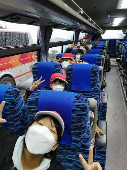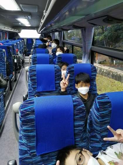 バスに乗りこみ海の家を出るところです。。疲れた表情も見えますが、元気です。