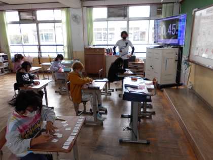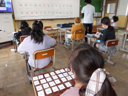 アルファベットを覚えるために,A〜Zまで書いたカードをシャッフルしておいて,順に並べるゲームをしました。今回は,それぞれがカードをもって,机の上で早く並べきる競争をしました。
