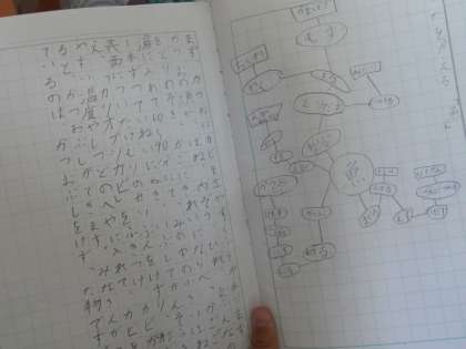 食べ物のひみつをノートにメモしています。