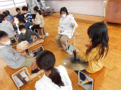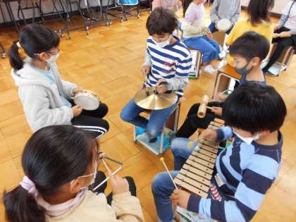 始めにリコーダーで「パフ」の練習をしました。かなり滑らかに吹くことができるようになりました。次に,魔法使いが魔法をかける場面の音楽を作りました。グロッケンやトライアングル,タンブリン,シンバル,ウッドブロックを一人ずつ分担して,「魔法」をかけた時の音を工夫しました。グループで相談しながら,いろいろ工夫していました