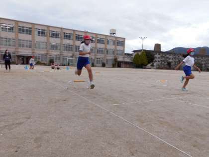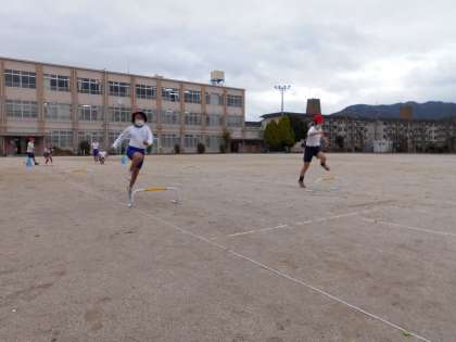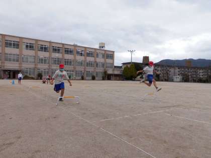 ハードル走に挑戦しています。始めなので低いハードルで歩幅の感覚を確かめて,リズムよく跳びこせる間隔を確かめました。協力し合って,高いハードルでも頑張ってほしいと思います。