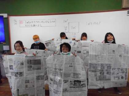 算数「面積」の学習では,新聞紙で1平方メートルの正方形を作り,作った1平方メートルでいろいろなものの大きさを調べました。まず教室の大きさは何平方メートルあるのか予想し,測ってみました。子ども達の予想では20〜40平方メートルという予想でしたが,実際に測ってみると64平方メートルもあり,子どもたちからは驚きの声があがっていました。