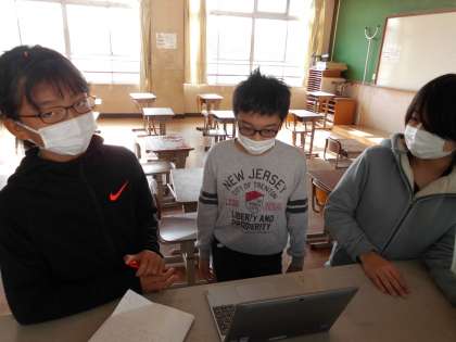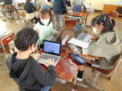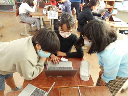 学習発表会で,みなさんをリモート旅行にいざないます。そのために,どうすれば聞いている人に伝わるかをグループで考えました。ロイロノートを使って提示資料を作ったので,それに自分たちの声を録音し,みんなで確認しました。「ここは,『おいしい』ということを伝えたいから It's delicious! と付け加えたらいいんちがう?」「かっこいいから It's cool! と言いたいな。」などとどんどん工夫が広がっていきました。