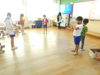 今年度は,運動場と体育館と教室の3つの場所に分けて,たてわり遊びを楽しんでいます。教室あそびで「こままわし」をすることになったグループは,「どうやってあそぶのか,わからない。」という低学年に6年生が優しく教えていました。