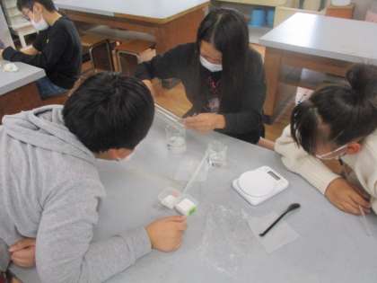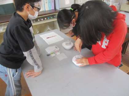「もののとけ方」で,今回は以前に溶け残った食塩・ミョウバンはどうやったら溶けるかを予想し,実際に溶けるかどうかを確かめてみました。子どもたちの予想は「水の量を増やす」「温める」の2つでした。そこで,その2つの方法で実験しました。すると,食塩・ミョウバンの溶ける量に違いはありましたが,予想通り溶けました。