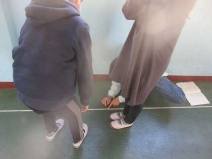 「平均とその利用」の学習で,10歩の平均から歩幅を計算することを学びました。そこで,自分の歩幅も測ってみました。グループで10歩を測り合い,計算して自分の歩幅を求めていました。