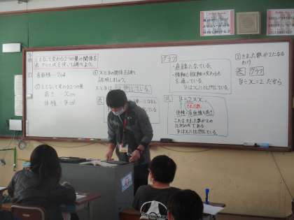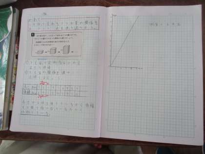 「比例と反比例」の学習で,表やグラフ,式を使って比例するかを説明しました。今まで学習してきた表やグラフ,式を使って上手に説明していました。