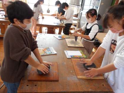 用途を考えて,楽しく使える焼き物を作りました。まずは,焼き物粘土をしっかりと練って成型していきます。「家族のためにコップを作りたいな。」「お皿を作って果物を乗せるようにしたい。」など使い道を考えて作っていきました。