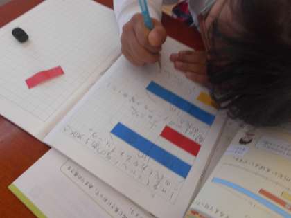 紙テープを使って,分数の数の仕組みについて考えました。
