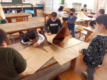 大きなクラフト紙の袋で「どんなことができるかな?」と考えながら,全身を使って,いろいろなことを試しました。これからこの袋を使って「ともだち」を作っていきます。