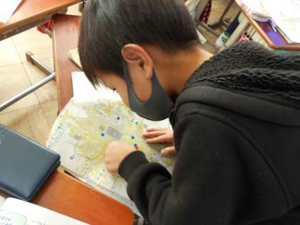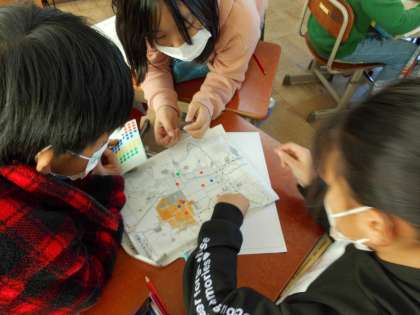 地図に公共施設ごとに色分けしたシールを貼って数の変化を調べ,なぜそのように変化してきたのかをまとめました。