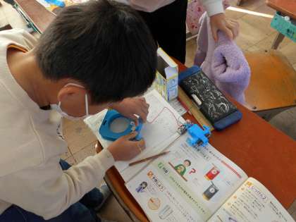 それぞれの素材に着目して,いろいろなものを回路の途中に挟んでみて,豆電球に明かりがつくかどうかで確かめることができました。