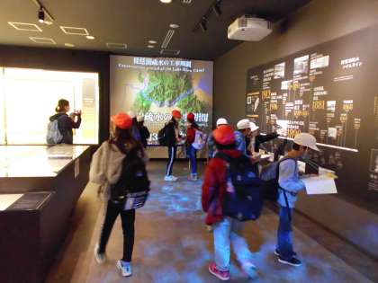 疏水記念館に到着。グループに分かれて,疏水クイズに答えていきます。「疏水建設に関わった人の数は何人?」「琵琶湖疏水建設に使われたレンガの数は?」グループで協力して答えを見つけていました。