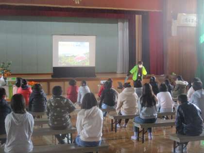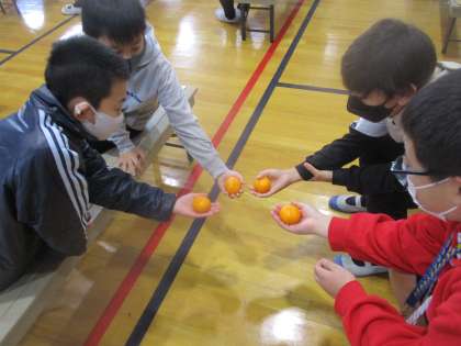 食育・農育授業としてみかんについて学習しました。和歌山県の有田市のみかん農家の方に来ていただいて,みかんについていろいろ教えてもらいました。最後にはおいしいみかんの見分け方やむき方を教えてもらい,実際に自分で見分けてむいて食べました。とてもおいしかったです。