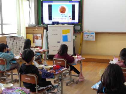 いつもと違うお米であることを伝えると,味わいながら食べていました。京北米を紹介する動画を観てる時には,京北米の他にも京北みそがあることを知り,「へえ〜。」と驚いていました。