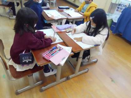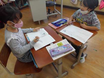 いろいろ意見を出し合いながら考えているペア,分かった子がもう一人の子に教えてあげているペアなど,ペア学習で答えを見つけ出していました。