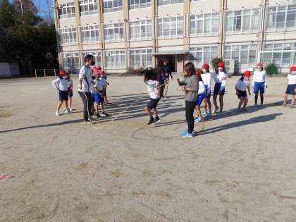 3年生と4年生の合同で,マラソン大会のコースを試走しました。その後で,大縄で八の字跳びをして,みんなで跳ぶことを楽しみました。