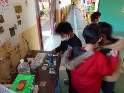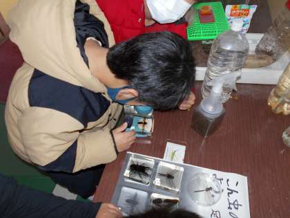 生き物コーナーに,昆虫を封入したプラスチック標本を展示しました。リアルな昆虫のすがたに驚く人,少しこわごわにのぞきこむ人,細かいところを実態顕微鏡で観察する人など,たくさんの人が興味をもって観察していました。