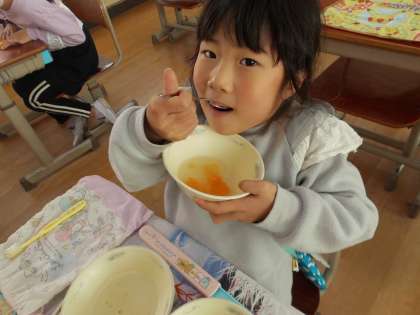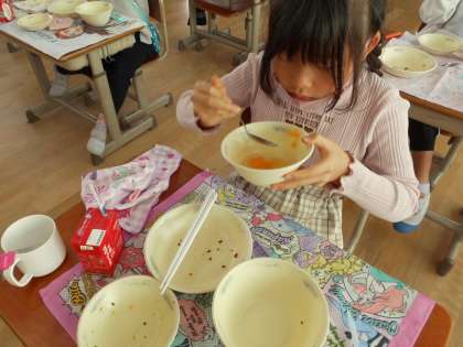 配られたときはスープのような状態だったのが,食べるころには固まっていることに驚いていました。