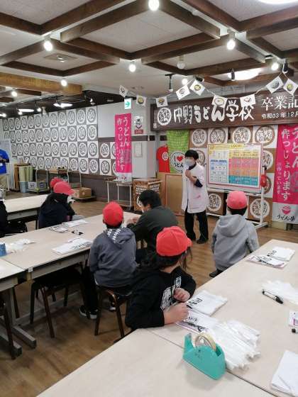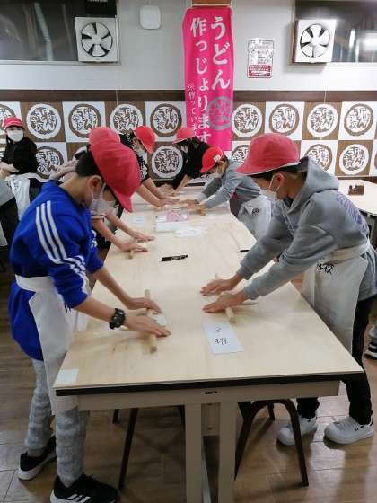 中野うどん学校でうどん作りをしました。うどんを伸ばしたり、切ったり、こねたりしました。お土産に切ったうどんとこねたうどんを持ち帰ります!