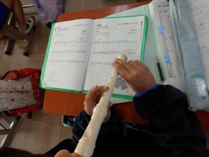 リコーダーで新しい曲「ジングルベル」の練習をしています。タンギングも上手になり歯切れ良い笛の音が聞かれました。
